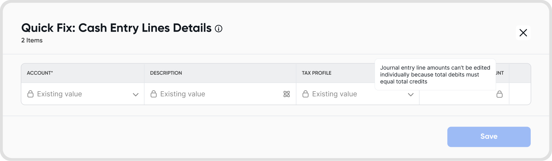 Some fields are restricted depending on the transaction type. For example, journal amounts cannot be edited in bulk to ensure debit and credit balances remain correct.