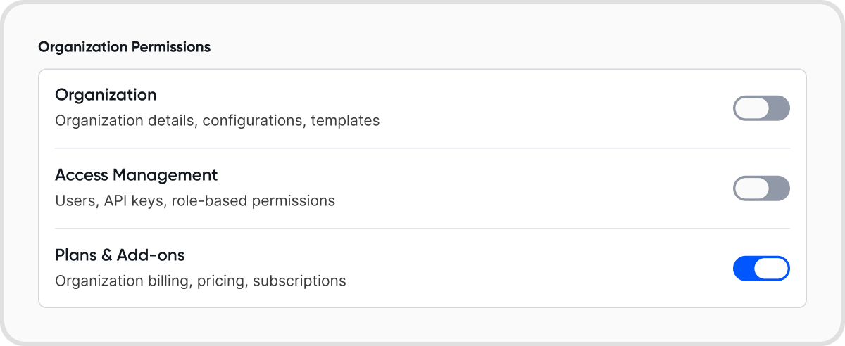 Select an admin member of your organization and under Organization Permissions enable Plans & Add-ons access.