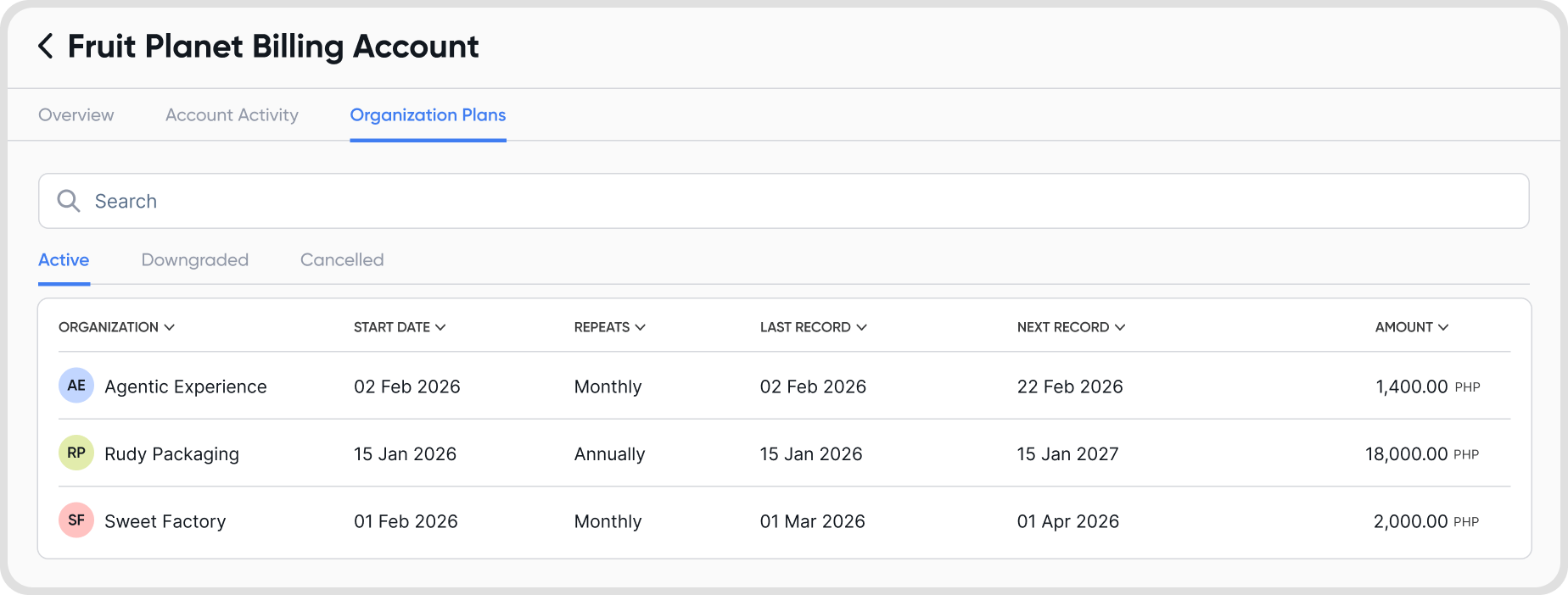 Go to Billing Accounts > Choose a Billing Account > Organization Plans. Under Organization Plans, you’ll see the following tabs: