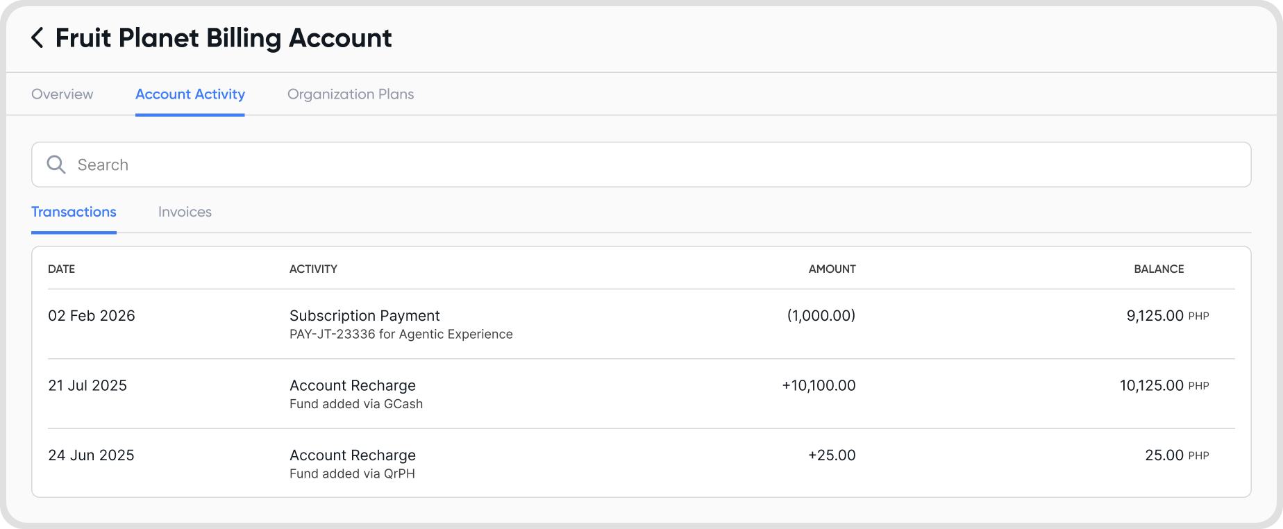 Transactions tab: Shows the history of balance recharges made to the billing account.