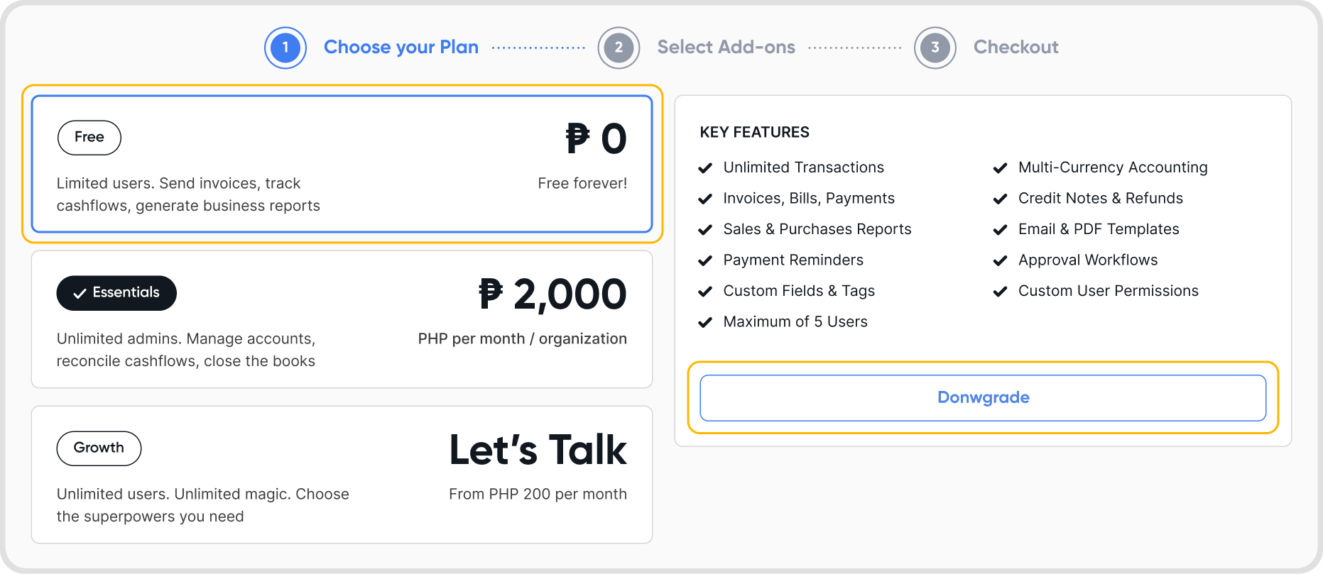 Choose the downgraded plan, such as Essentials to Free, Growth to Essentials, or Growth to Free. After confirming, a downgrade schedule confirmation will appear.