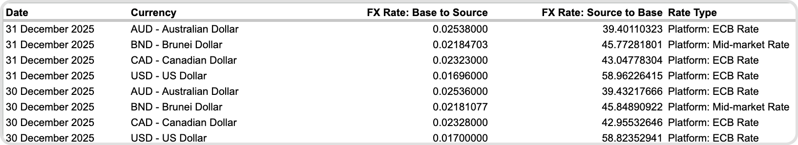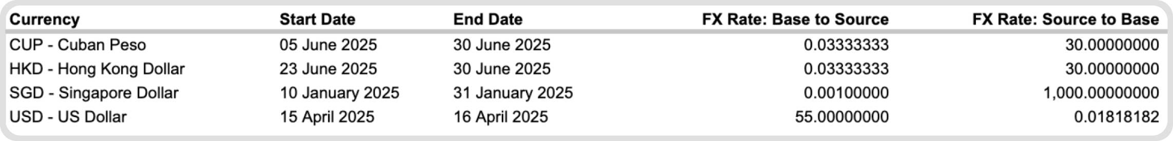 A report of historical exchange rates by date and currency, including conversion values and sources.