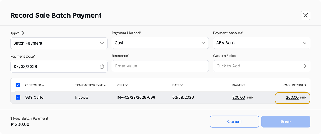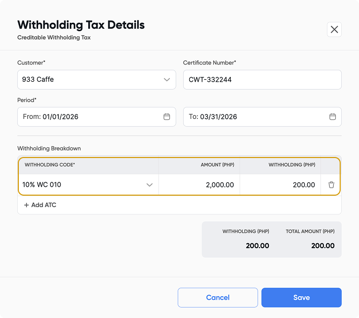 For example, if the invoice is ₱2,000 and the client withheld ₱200 (10%), change the cash received amount from ₱2,000 to ₱200.