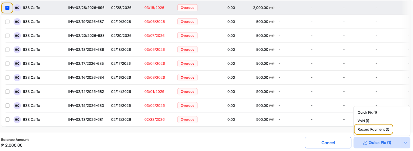 A CWT is a form of credits you can apply as payment to your invoice. Choose the checkbox of the invoice you wish to record CWT > click Record Payment > this will open the Batch Payment function.