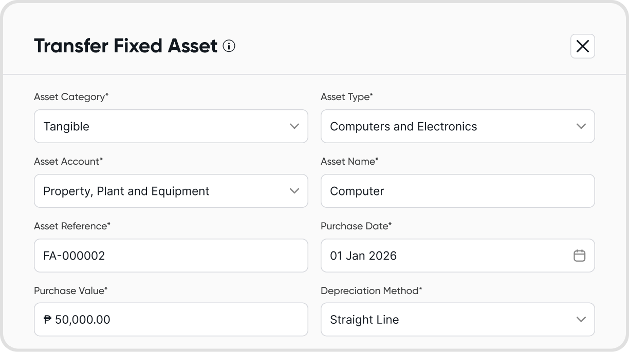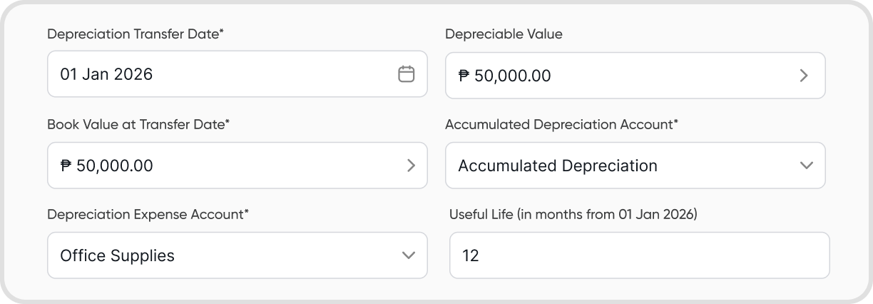 Enter the asset’s value as of the lock date. For example: If the purchase value is PHP 50,000 and the current value is PHP 25,000, input PHP 25,000.