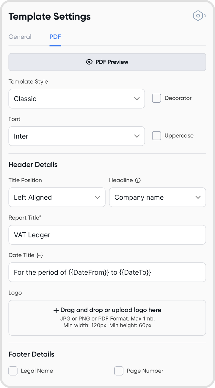 Go to Settings > Templates > Reports > Accounting Tab, then click New Template (VAT Ledger).