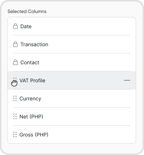 Note: Date, Transaction, and Description are locked. This means you cannot hide or re-arrange them. (PHP) pertains to the org’s default currency.