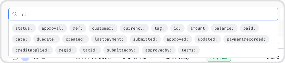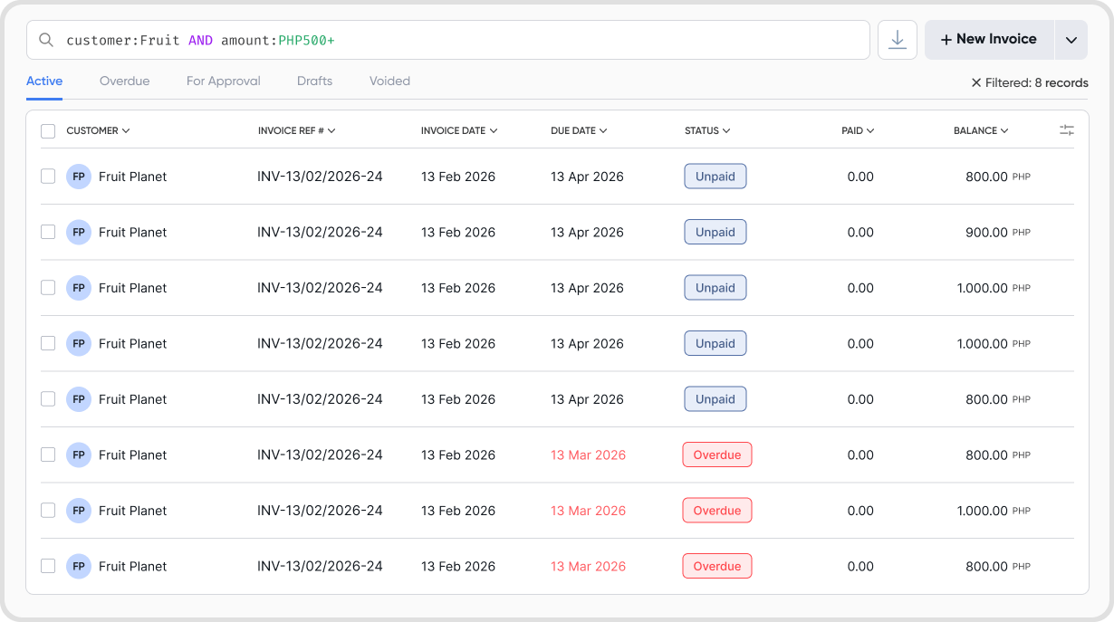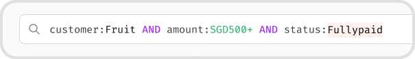 All Match | status:overdue PHP500+ | status:unpaid AND supplier:acme |