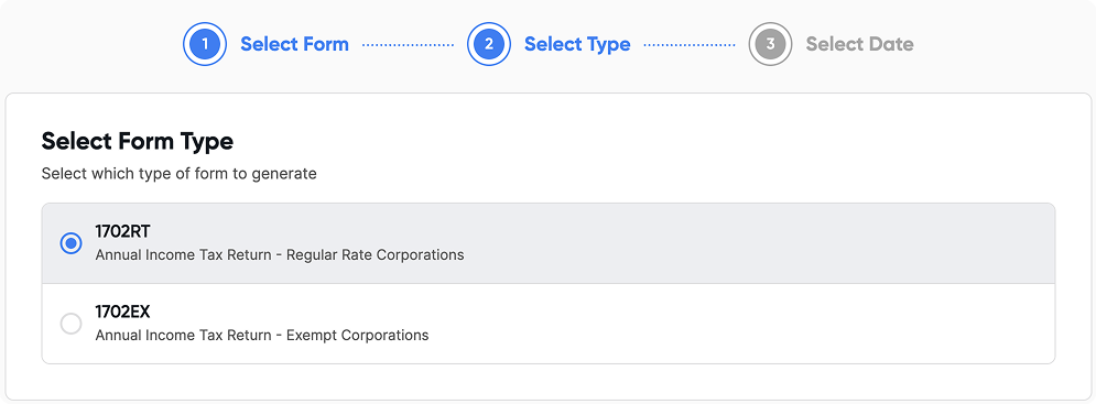 Select Form 1702, choose the correct taxable year, and click proceed to enter the return screen.