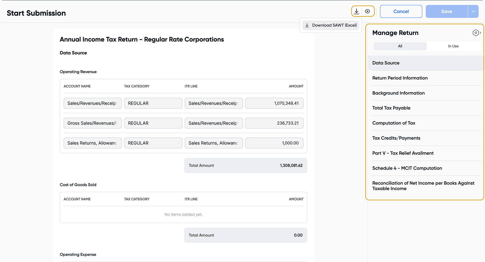 Creditable withholding taxes applied to your sales will automatically appear here (which also generates your SAWT attachment).