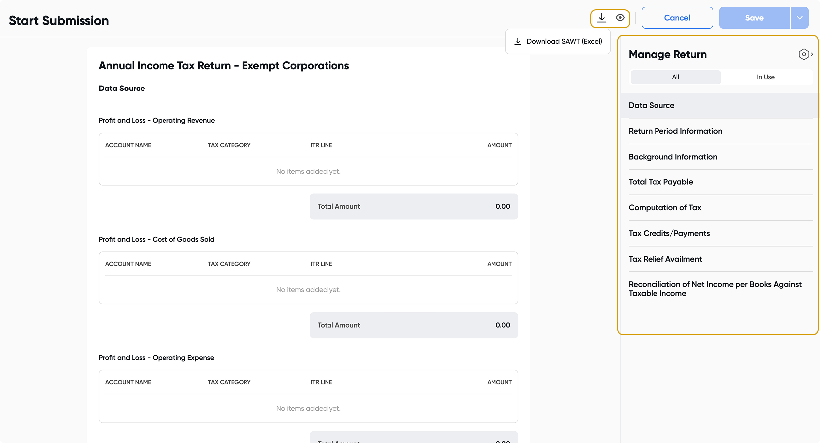 Click the Download button (if available) to download your SAWT attachment, which is generated from creditable withholding taxes on your sales.