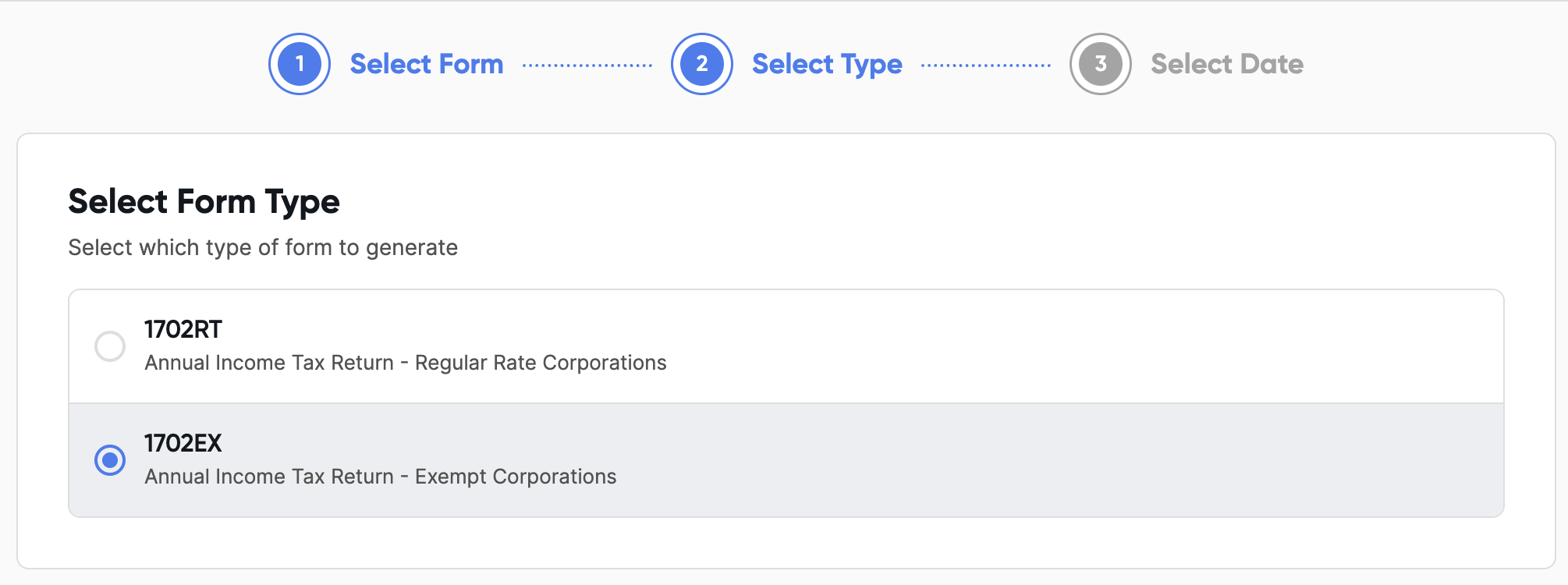 Select Form 1702-EX, choose the correct taxable year, and click proceed to enter the return screen.