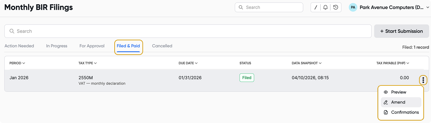 Go to Filed & Paid tab > hover over a tax form > click the 3 dot icon and choose Amend