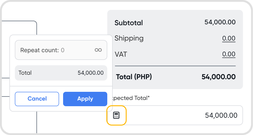 Open a quote in Edit mode → go to the expected total field (below the total table) → click the calculator icon→ set repeat count or set to infinite