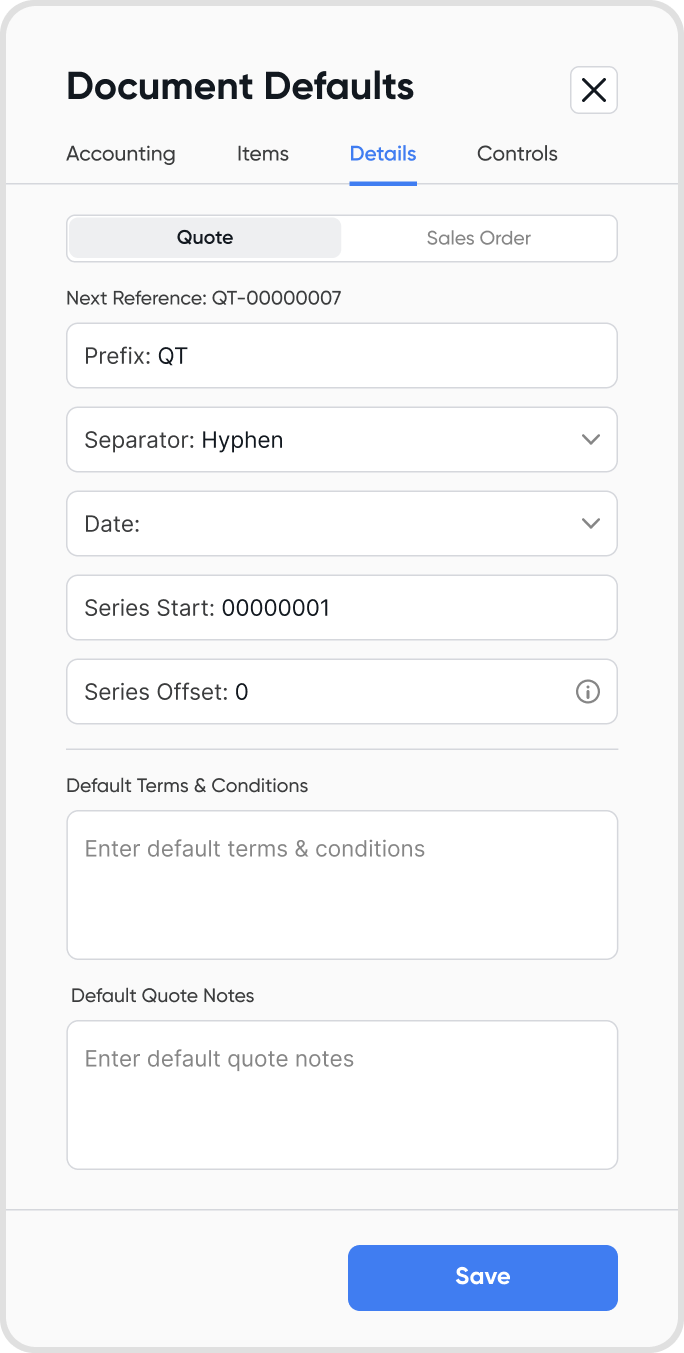 Open the quote in Edit mode → go to Quote settings (Cmd/Ctrl + B) → Document Defaults → Details → Quote