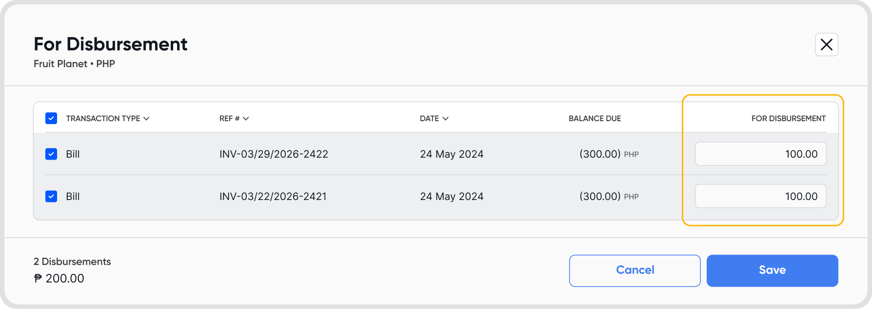 Yes. While on the disbursement screen, click on the amount field and enter the amount you want to disburse.