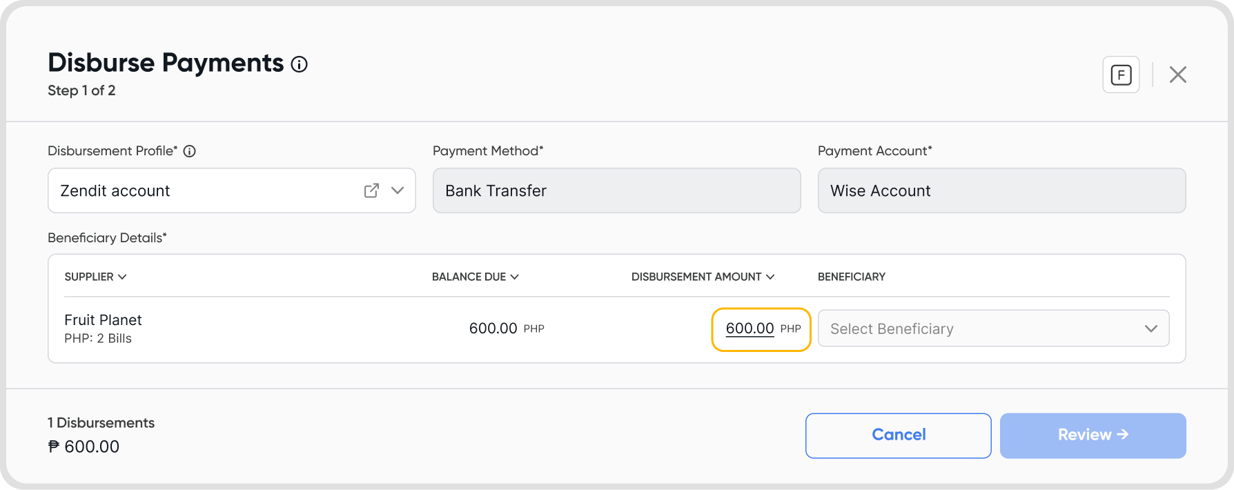 Add or select the beneficiary account for each vendor. This is the account where the payment will be sent. Review and then disburse.